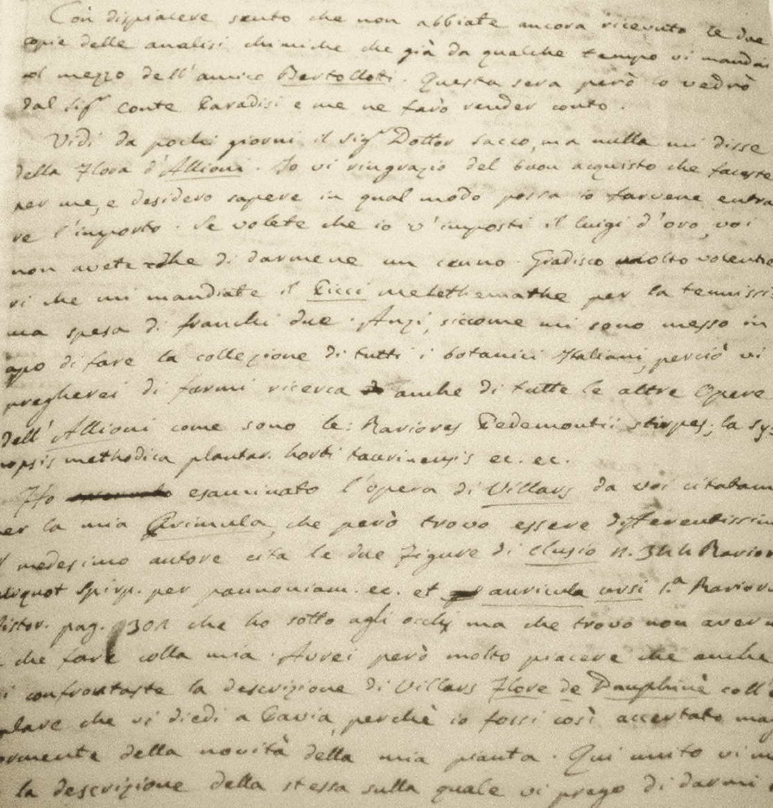 Il linguaggio dell’epoca pare oggi singolare e a tratti poco comprensibile. Ma dagli scritti del nostro speziale, la cui calligrafia è curata e leggibile, emerge come egli si inoltri con passione “in questo piacevole Studio Botanico”. E talvolta, essendo vincolato agli impegnato religiosi “non potendo andar io per le montagne lascio a molti pastori di portarmi l’erbe che le vengono alle mani ma essendo questi assai dati all’ozio, ben di rado ne posso ottenere da loro”. Ricavo quindi informazioni strettamente legate alla Valle Pesio, come il numero approssimato di “3000 anime” e “il numero immenso delle pecore e capre … che eccedono i 4milla”. Una triste informazione riguardante la maggior parte degli abitanti è poi nel passaggio di una lettera al Bellardi: “non potrebbe trattener le lacrime nel veder tante miserie, e l’ assicuro che se non fosse del Soccorso della Certosa il più perirebbe, li necessita di tutto”.
